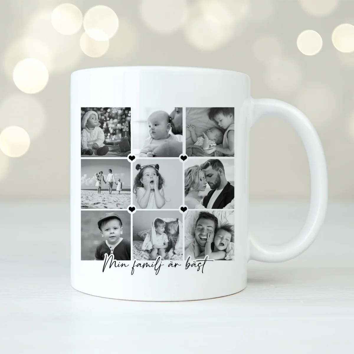Skrolla igenom fotoalbumet i telefonen och ladda upp dina favoritbilder. Snabbt och enkelt har du ett fint kollage på en mugg som du kan beundra dag ut och dag in medans du dricker ditt kaffe.