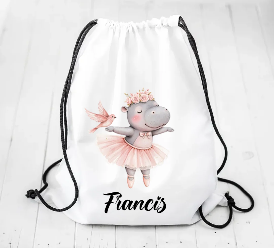 En gympapåse med en gullig flodhäst i ballerinakläder och plats för namn.