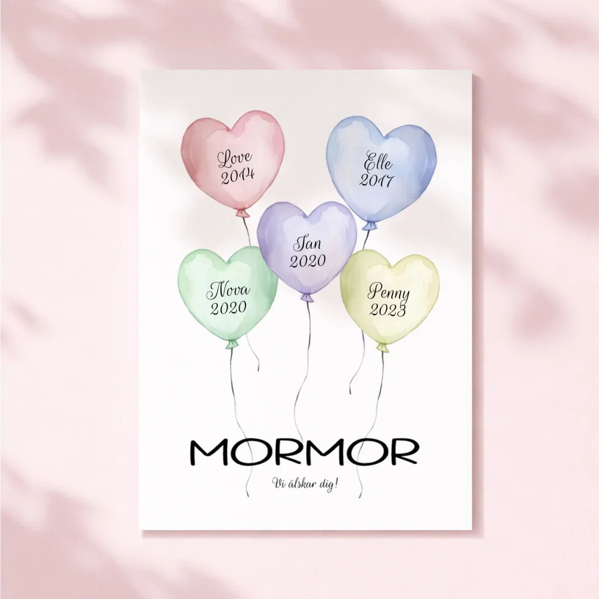 En vacker personlig poster med färgglada ballonger som bär namnen på älskade barnbarn tillsammans med födelseåren om du önskar. Varje ballong är en liten celebration av ett speciellt barn i mor- eller farförälderns liv. Välj själv hur många ballonger du vill ha och vilka färger som passar bäst i mottagarens hem. En meningsfull och personlig gåva som väcker leenden varje gång man ser den på väggen. Perfekt att ge från barnbarnen eller från dig själv. En poster som blir en kärleksfull påminnelse om familjen och de speciella stunderna tillsammans.