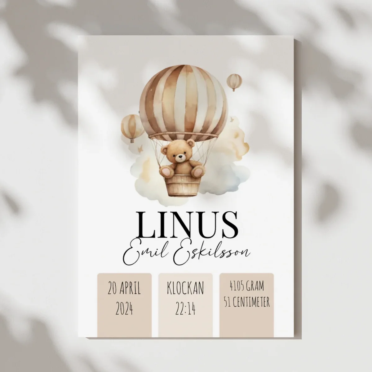 En superfin poster till barnrummet i naturnära toner! Denna födelseposter, som barnet kan ha på väggen i flera år, är en perfekt gåva att ge på dopdagen. Den gulliga nallen i kombination med barnets namn och födelsedatum gör denna till en otroligt fin och personlig present!