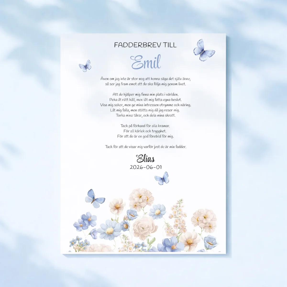 Ett vackert fadderbrev med blå blommor – perfekt för att visa ditt barns gudmor eller gudfar hur mycket hen betyder för er. Brevet har plats för namn och dina egna ord, eller så kan du välja vår förskrivna text som fångar känslan precis rätt. Brevet blir helt personligt och är ett hjärtligt sätt att tacka din fadder på dopdagen eller någon annan speciell dag. En gåva fylld av värme och betyder något på riktigt.
