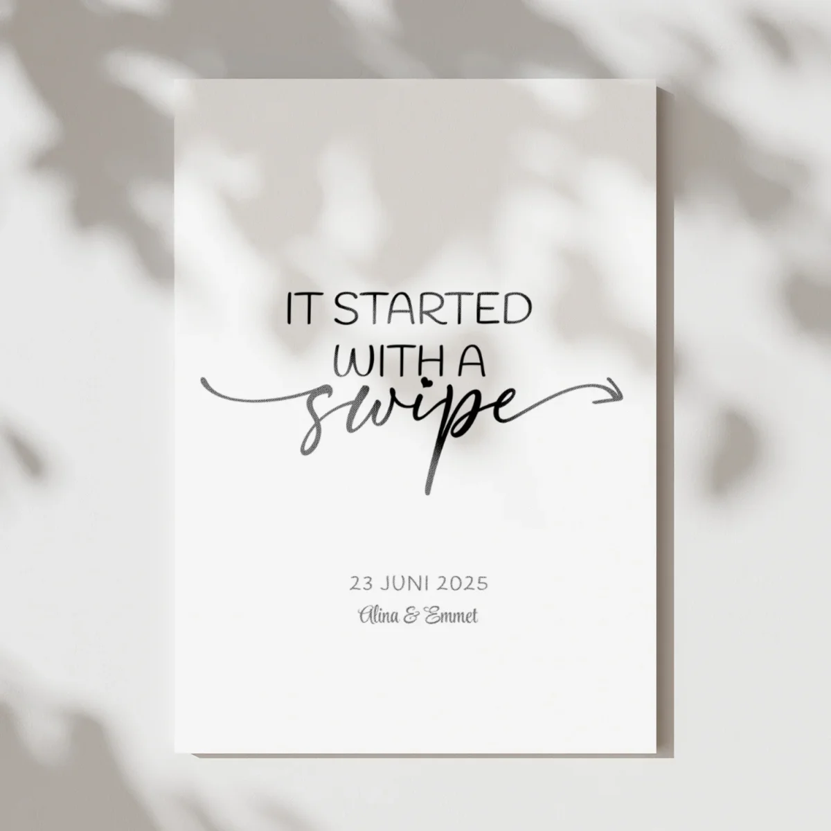 En modern och kärleksfull poster som fångar början på er historia. Med texten “It started with a swipe” hyllar den det där första ögonblicket som förändrade allt – matchen, konversationen och känslan av “det här kan bli något”.