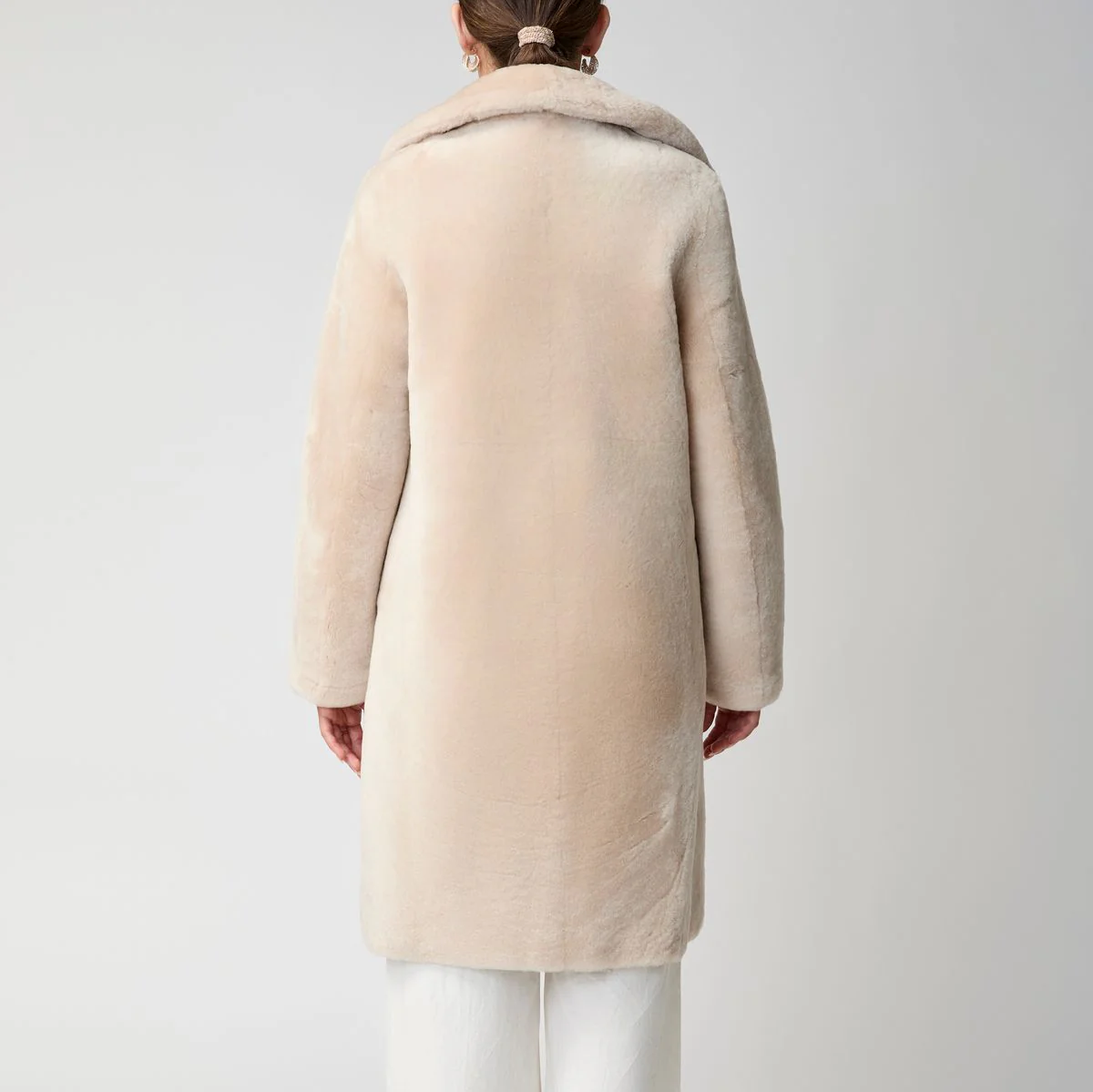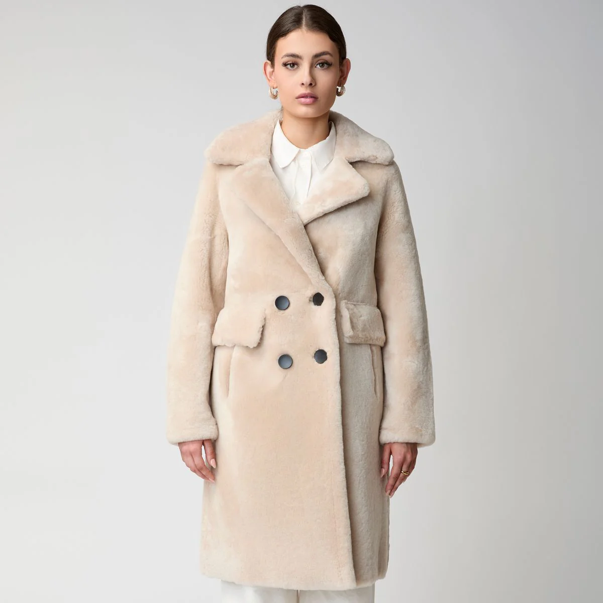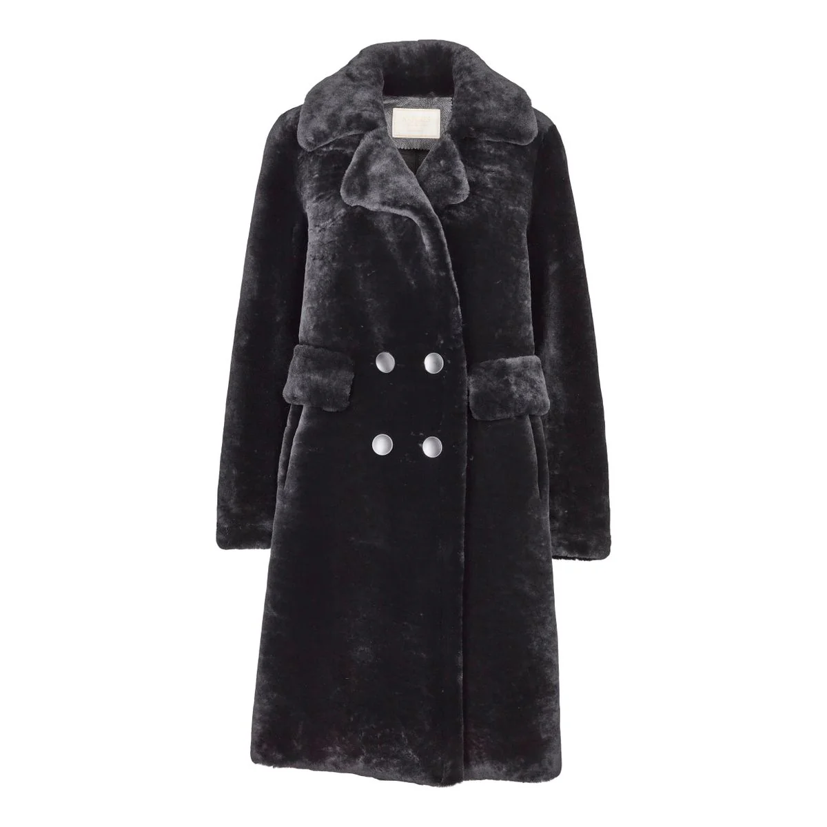 En härlig pälsjacka i längre modell. Gjord av dubbelsidigt fårskinn för extra värme och komfort då båda sidor är av päls. Två stora fickor fram. Kappan stängs med knappar fram. Härligt och lätt att bära med denna klassiska design.
