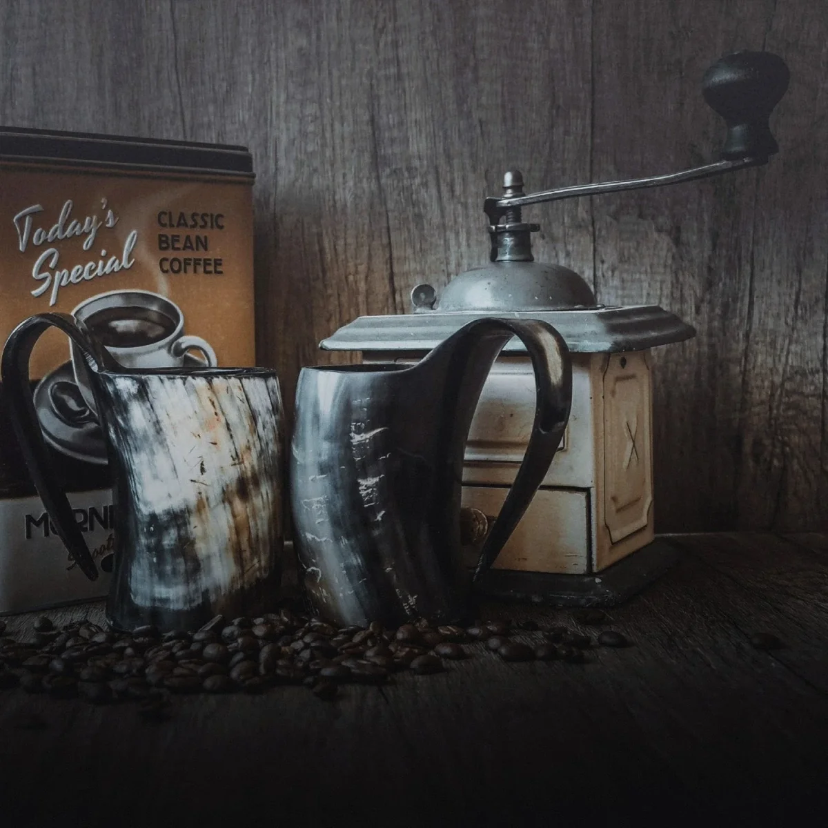 Nordlys Viking presenterar stolt världens första kaffemugg i horn, som garanterat håller för alla varma drycker. Den kan givetvis även användas till andra, både varma och kalla drycker. Så den passar lika bra till te, öl, vatten eller läsk.
