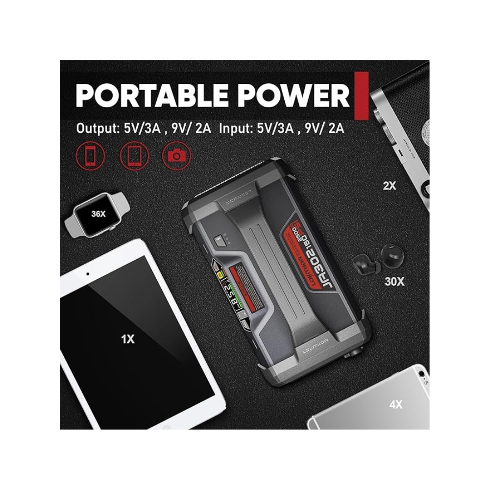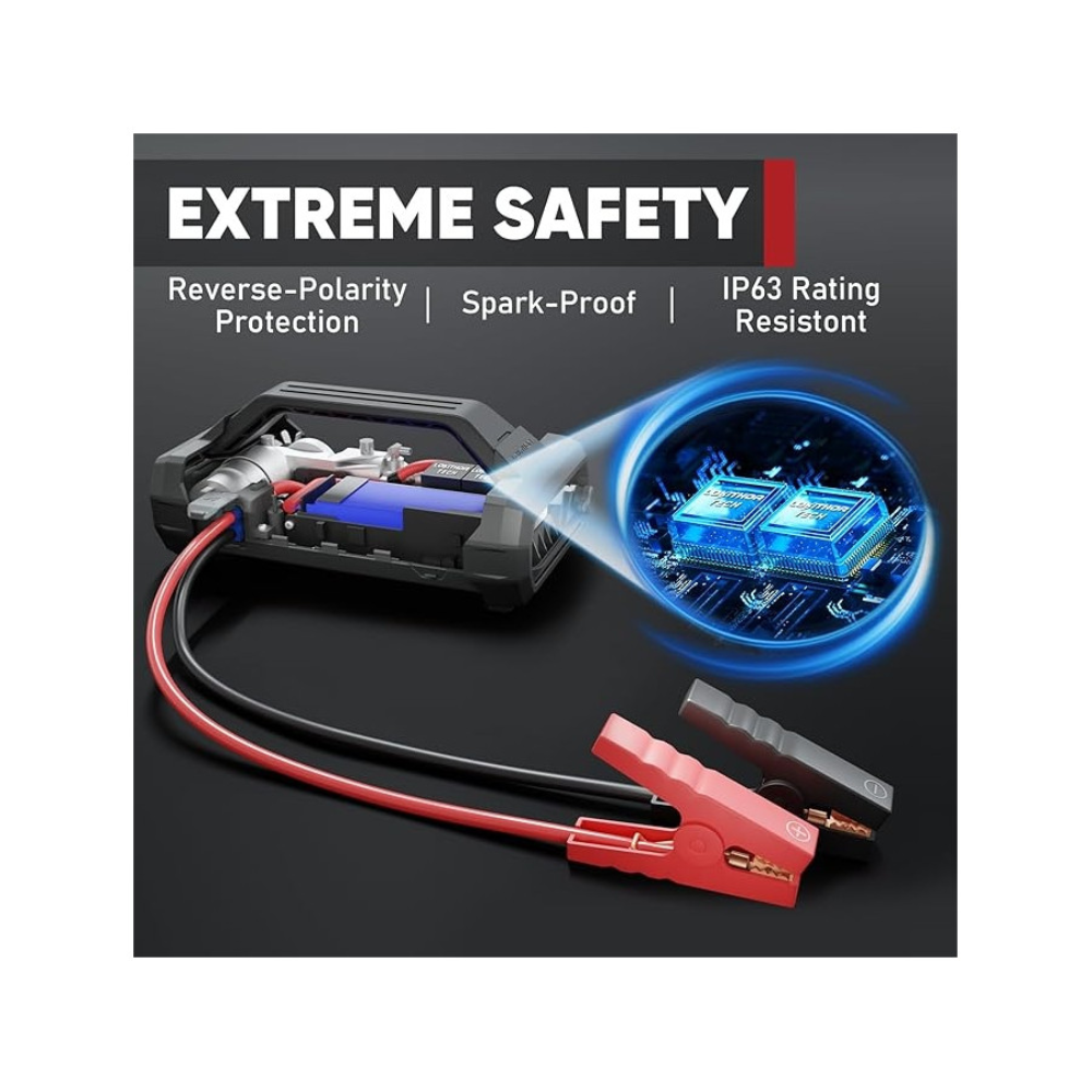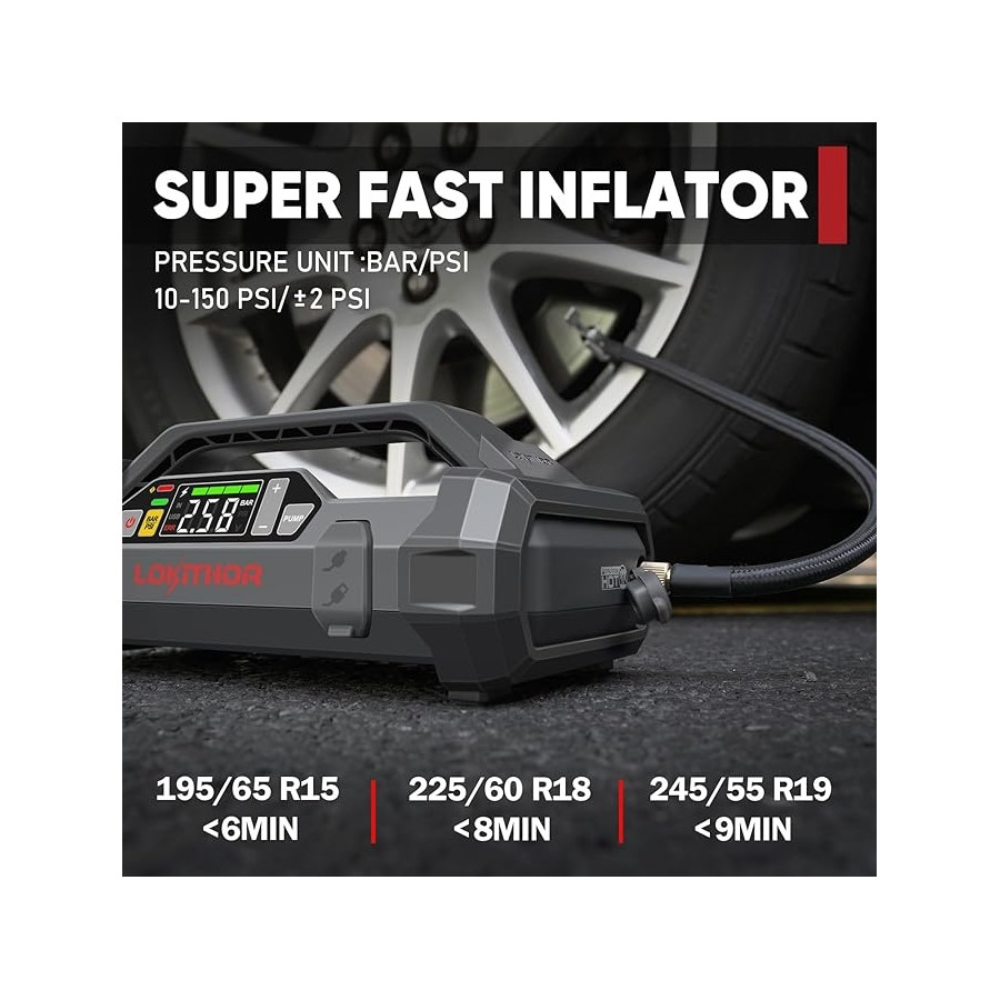 Den digitala luftpumpen levererar 150 PSI och 35 L/min, med automatisk avstängning vid förinställda tryck. Ett bildäck kan pumpas från 0 till 35 PSI på 5 minuter. Lokithor Startbooster övervakar bilbatteriets spänning i realtid och har omfattande skyddsfunktioner inklusive kortslutningsskydd och överströmsskydd. Den fungerar även som en LED-ficklampa och en snabbladdande powerbank för USB-enheter.