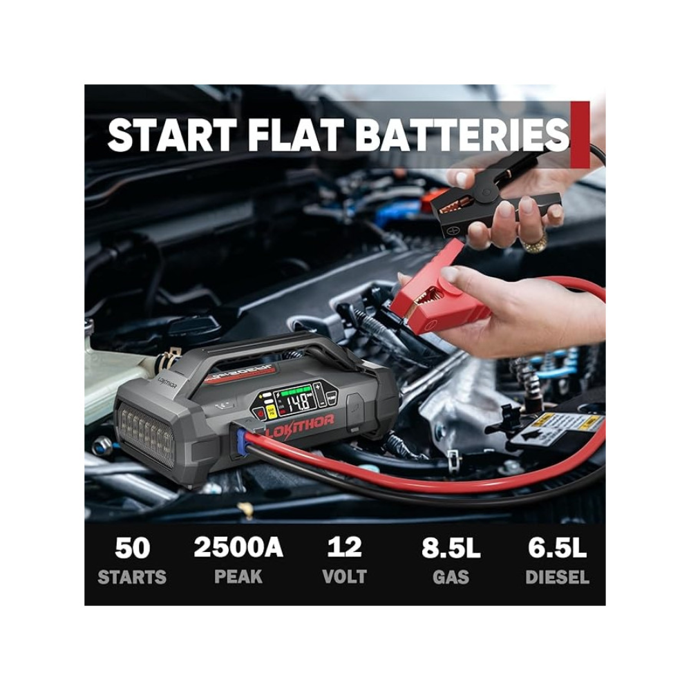 Lokithor bärbara starthjälp ger en kraftfull startström på 2500 A och kan starta din bil på 1-3 sekunder, med upp till 40 starter per laddning. Lokithor Startbooster har en låg standbyström och en livslängd på 900 dagar.