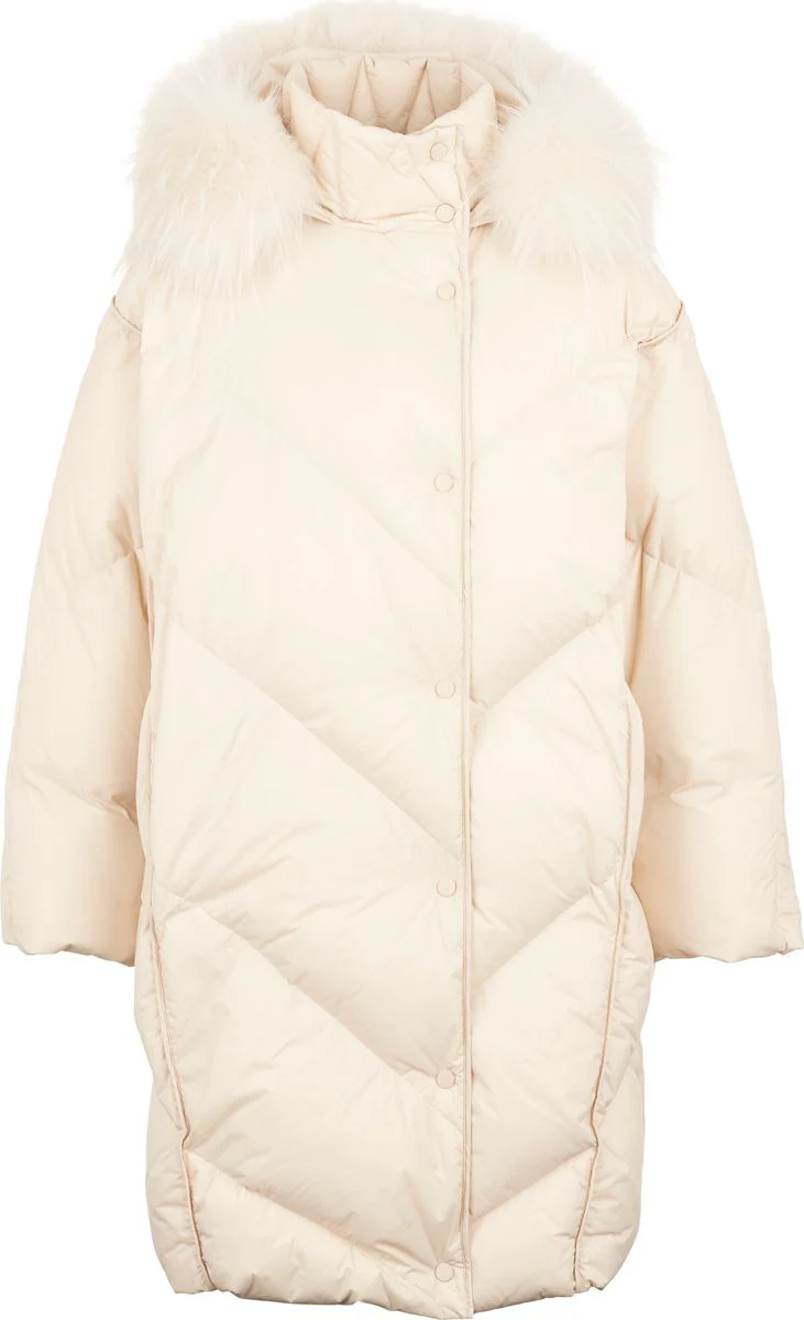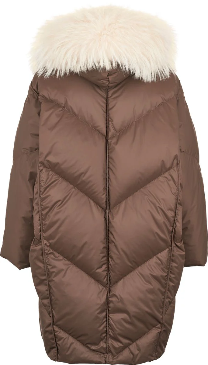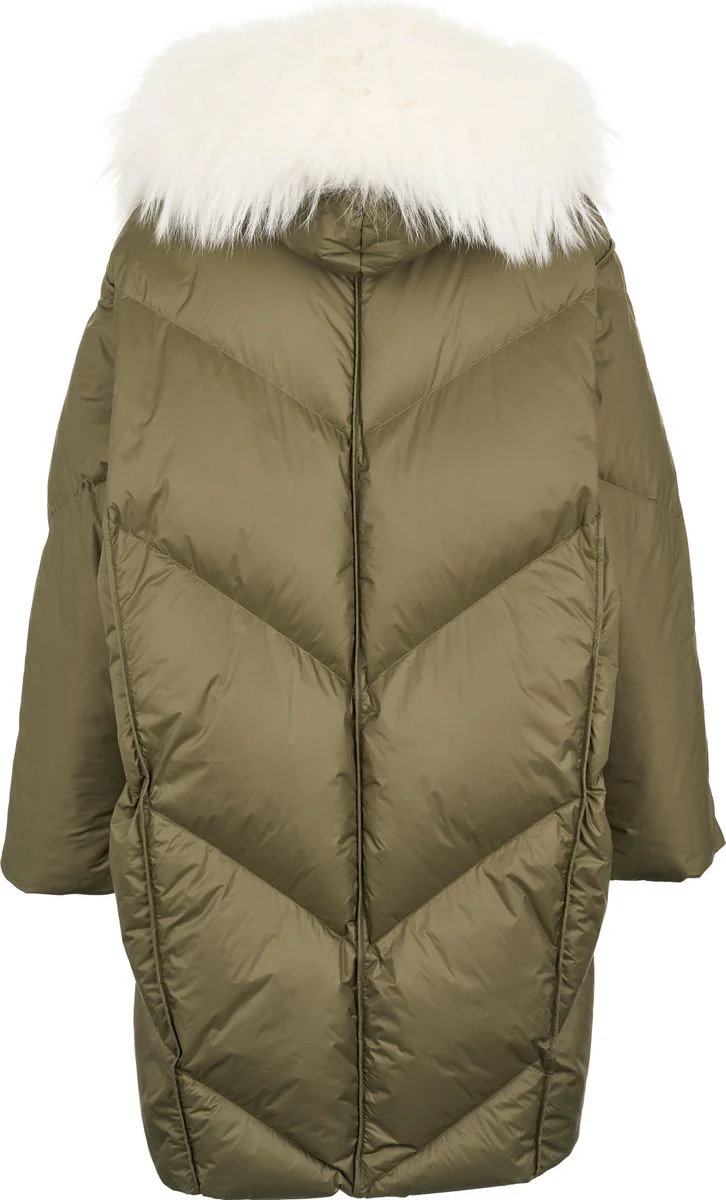 Varm, tjock och härlig jacka fodrad med gåsdun vilket gör den lätt att bära. Snygg krage i äkta rävpäls. Två fickor fram och stängd med dragkedja samt knappar.