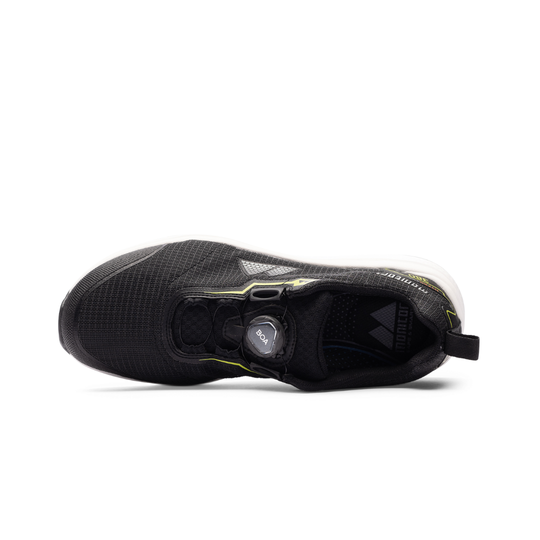 Med BOA® Fit System och L6-dial på vristen kombinerar Three 100 Eighty prestanda med en sportig känsla. Skons ovandel är tillverkad av Hypertex-material, känt för sin lätta vikt och slitstyrka, och fokuserar på andningsförmåga. Trots sin lätta konstruktion erbjuder skon en bred passform för komfort. Yttersulan är gjord av gummi med en EVA-mellansula för optimal stötdämpning. Innersulan, Monitors Pro Support recycle sula, är tillverkad av återvunnet Polyuretan. Förmodligen världens lättaste säkerhetssko!