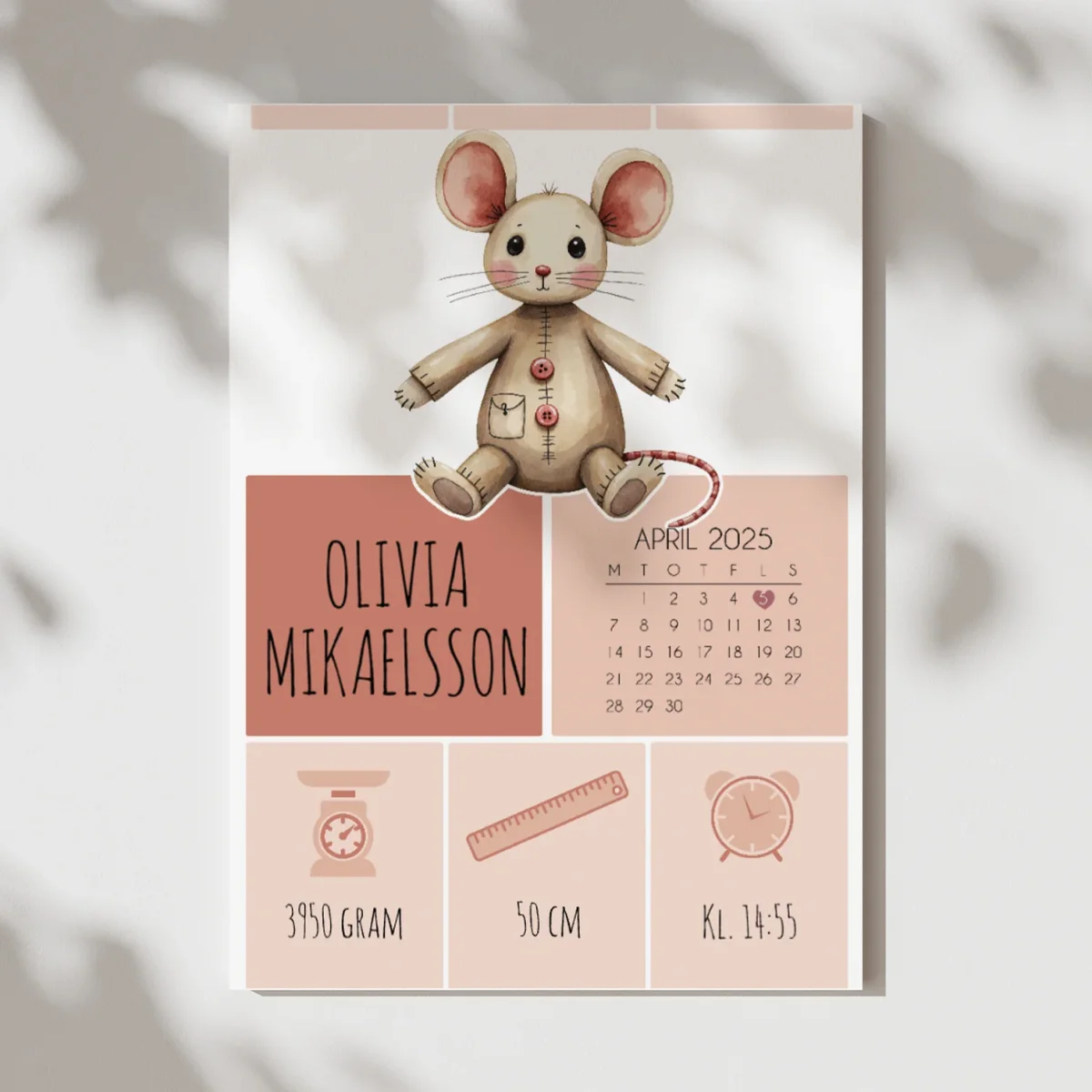 En charmig tavla med en söt liten mus som symbol för mod, nyfikenhet och det lilla i det stora. Den minimalistiska designen lyfter fram barnets namn och alla viktiga födelsedetaljer i en mjuk och stilren komposition.