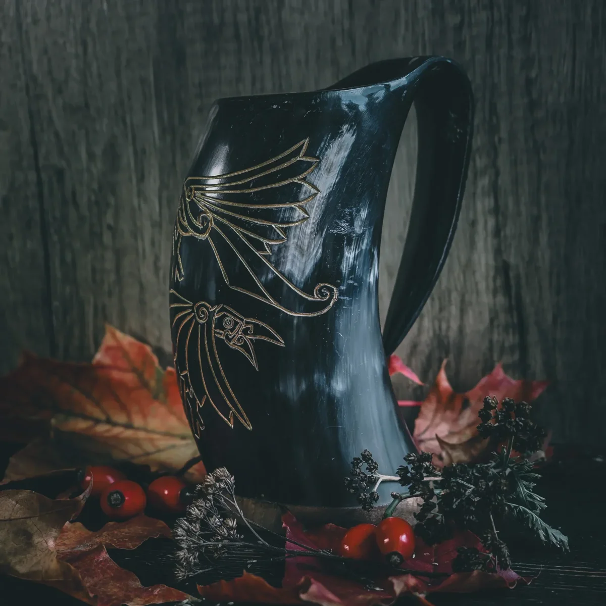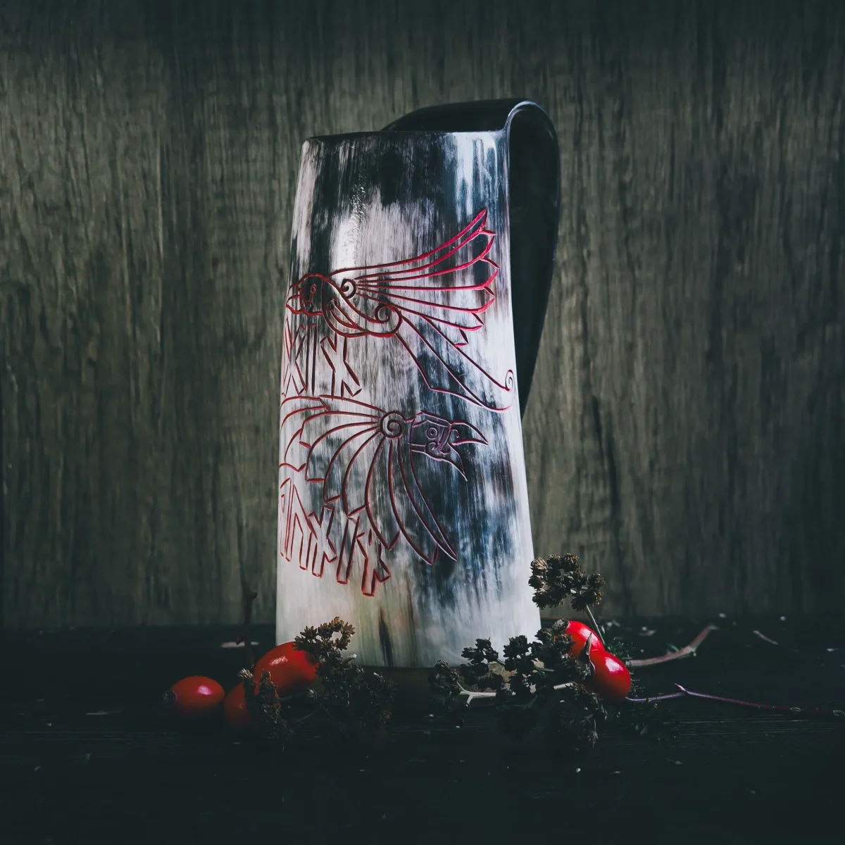 Ett äkta handsnidat ölkrus med Hugin och Munin ingraverat som dekoration. Tillsammans med fåglarna står även runtexten Hugin Munin.
