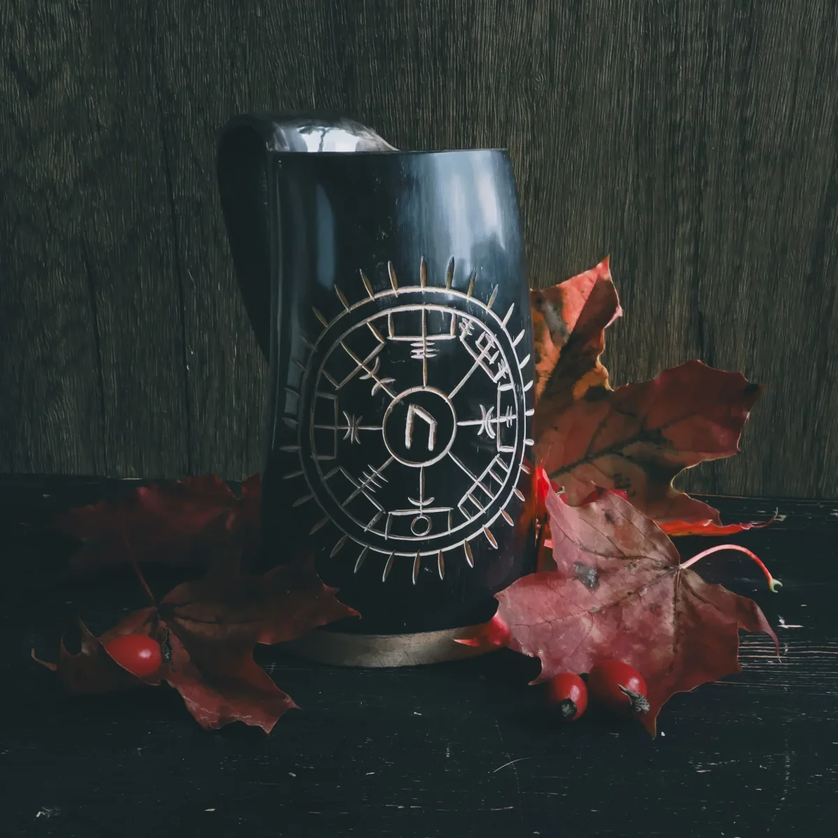 Ett äkta handsnidat ölkrus med en graverad bindruna med Ur runan i mitten. Skåla ordentligt på vikingavis, i goda vänners lag. Det praktiska handtaget gör också kruset lätt att hänga i bältet. Modellen är väldigt stryktålig men passar sig inte för uppvärmda drycker. Insidan är polerad och lackerad. Graveringen är inspirerad av en isländsk bindruna som hittats i ett manuskript från 1800-talet. Bindrunan ska leda dig rätt på livets färd. I mitten har vi placerat en vikingatida Ur runa som förstärker magin.