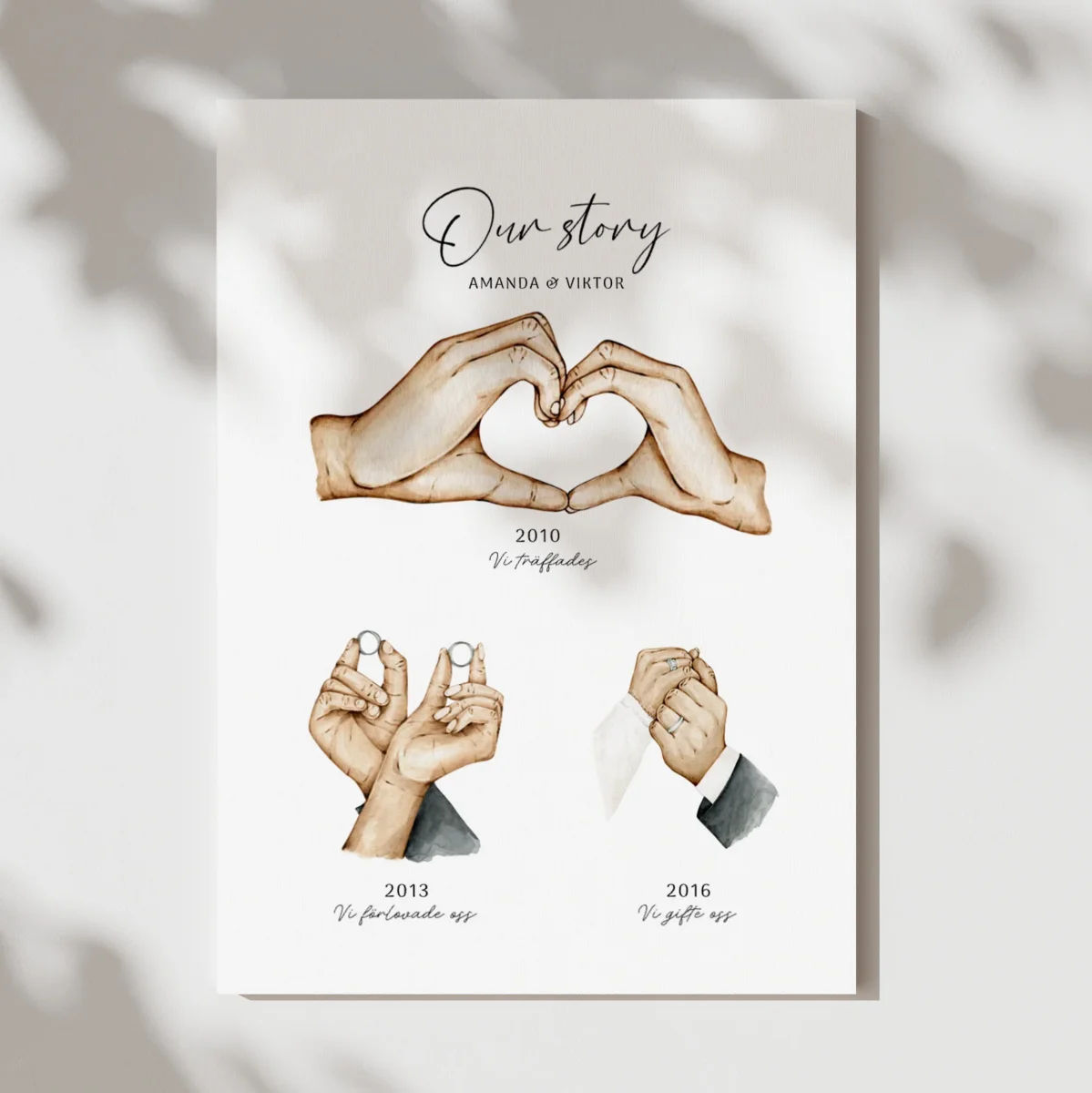 Vackra illustrationer av händer som visar brudparets resa tillsammans fram till bröllopet – när de träffades, förlovade sig och slutligen gifte sig. En perfekt bröllopspresent!
