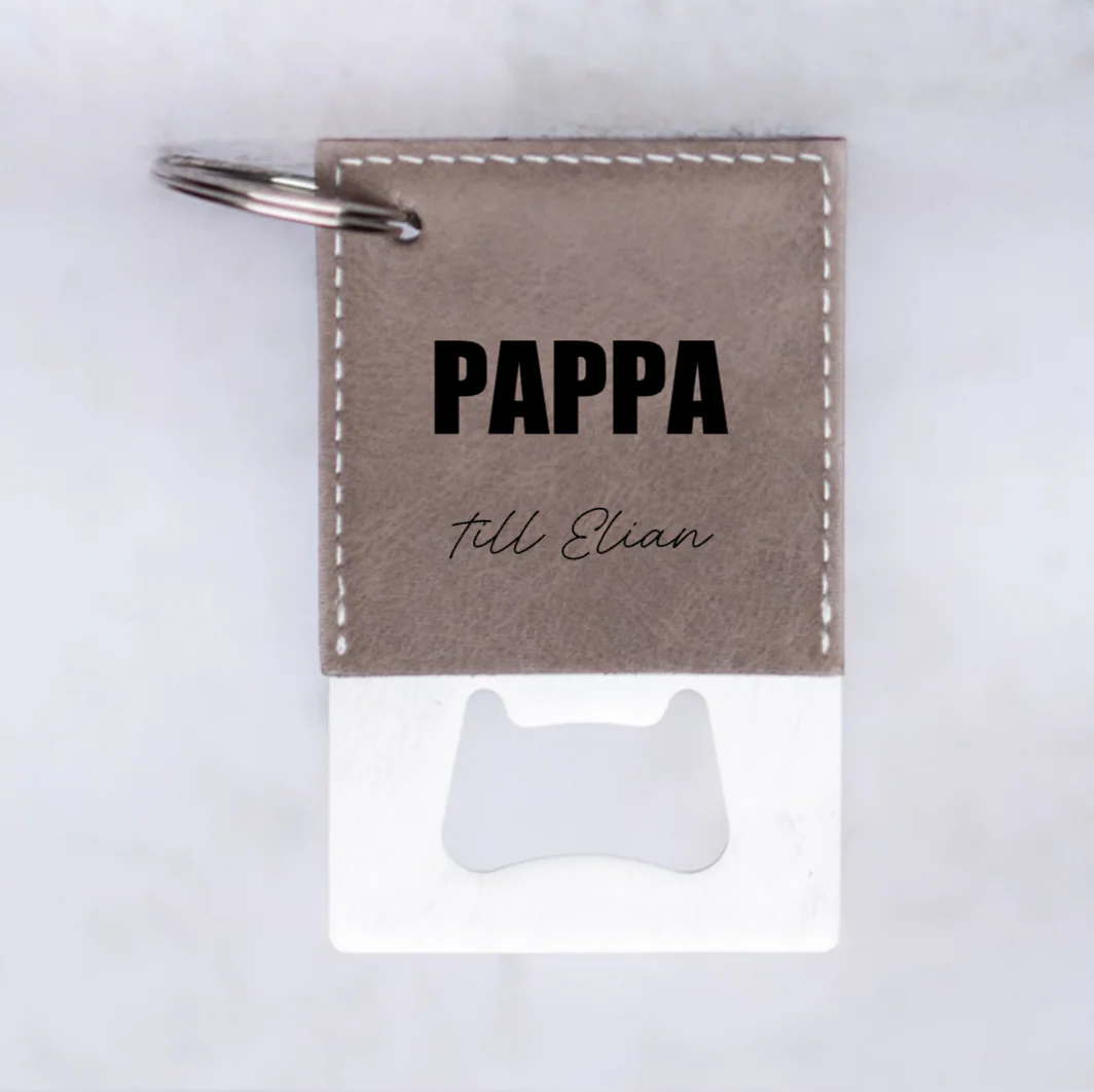 En personlig kapsylöppnare i syntetiskt läder med valfri text tryckt på. Denna kapsylöppnare är stilren, rejäl och ger ett fint intryck.