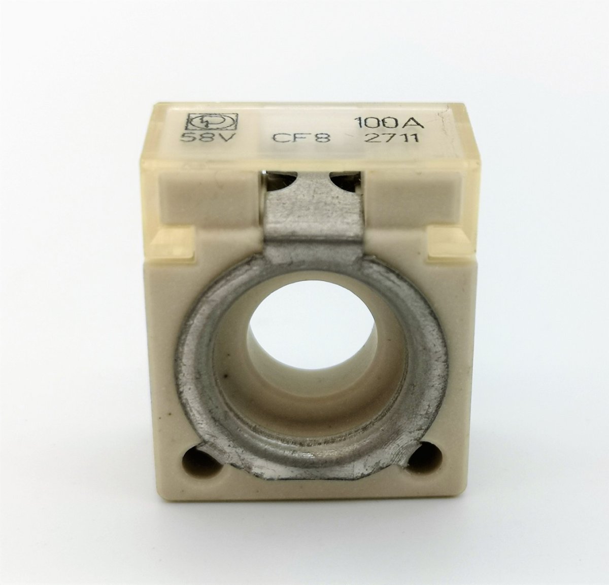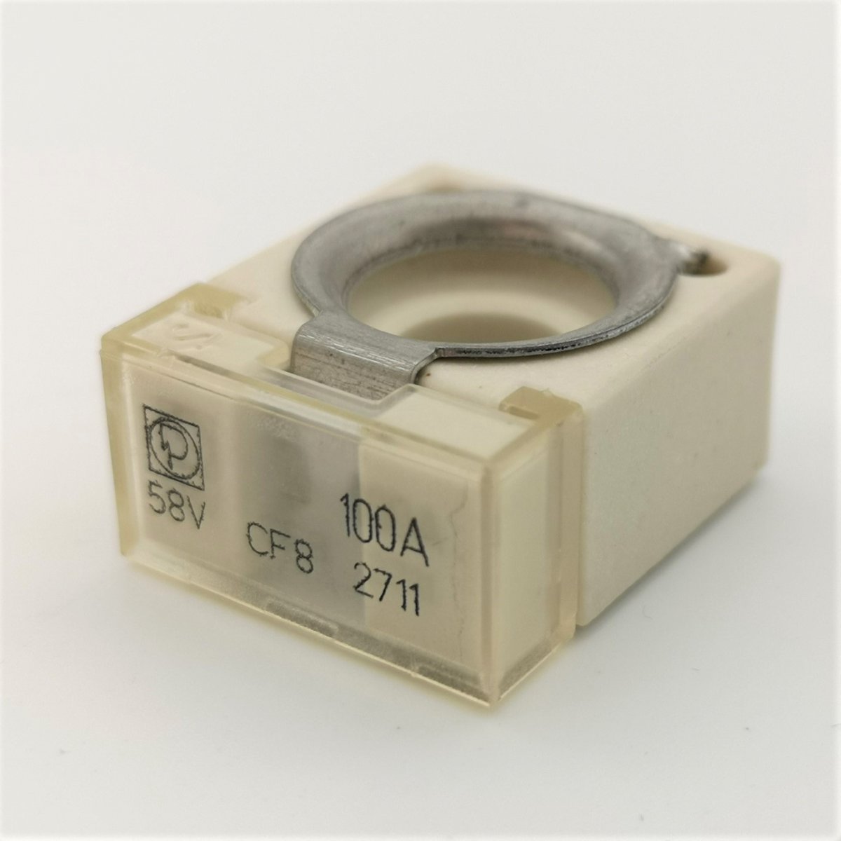 Pudenz Polsäkring 100A CF82711. Huvudsäkring för fastsättning till terminalen på batteriet. Med transparent lock för visuell inspektion smältelement.