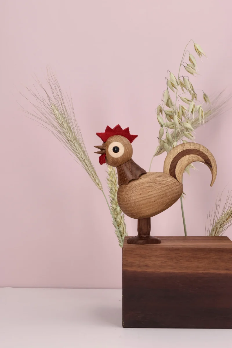 Rise från Spring Copenhagen är en färgstark trätupp som sprider energi och personlighet i hemmet. Med sin uppblåsta bröstkorg, distinkta kam och stolta hållning står han stadigt – som om han just hälsar morgonen välkommen.