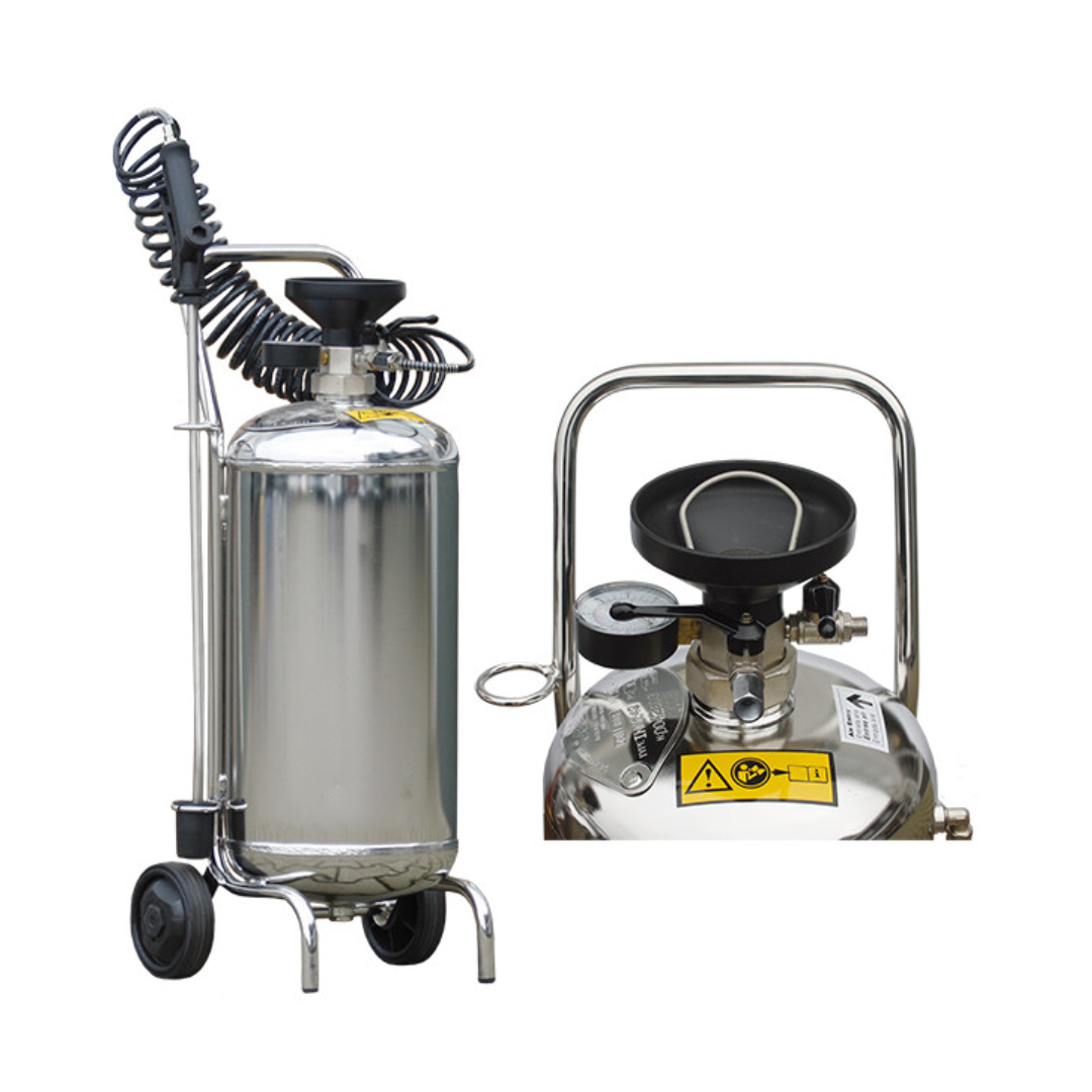 Fyllningen av den rostfria Koncentratsprutan är mycket enkel och sker med hjälp av en plasttratt. Utrustningen inkluderar en standardsäkerhetsventil för extra trygghet. En kemikalieresistent slang på 10 meter ingår, liksom en 600 mm spraylans med munstycke för effektiv applicering. Enheten har en tydlig nivåvisning och är idealisk för användning inom livsmedelsindustrin, biltvättar och olika industrier. Den är också utrustad med Viton-packningar och har en 1/4″ hankoppling för tryckluftstillförsel.