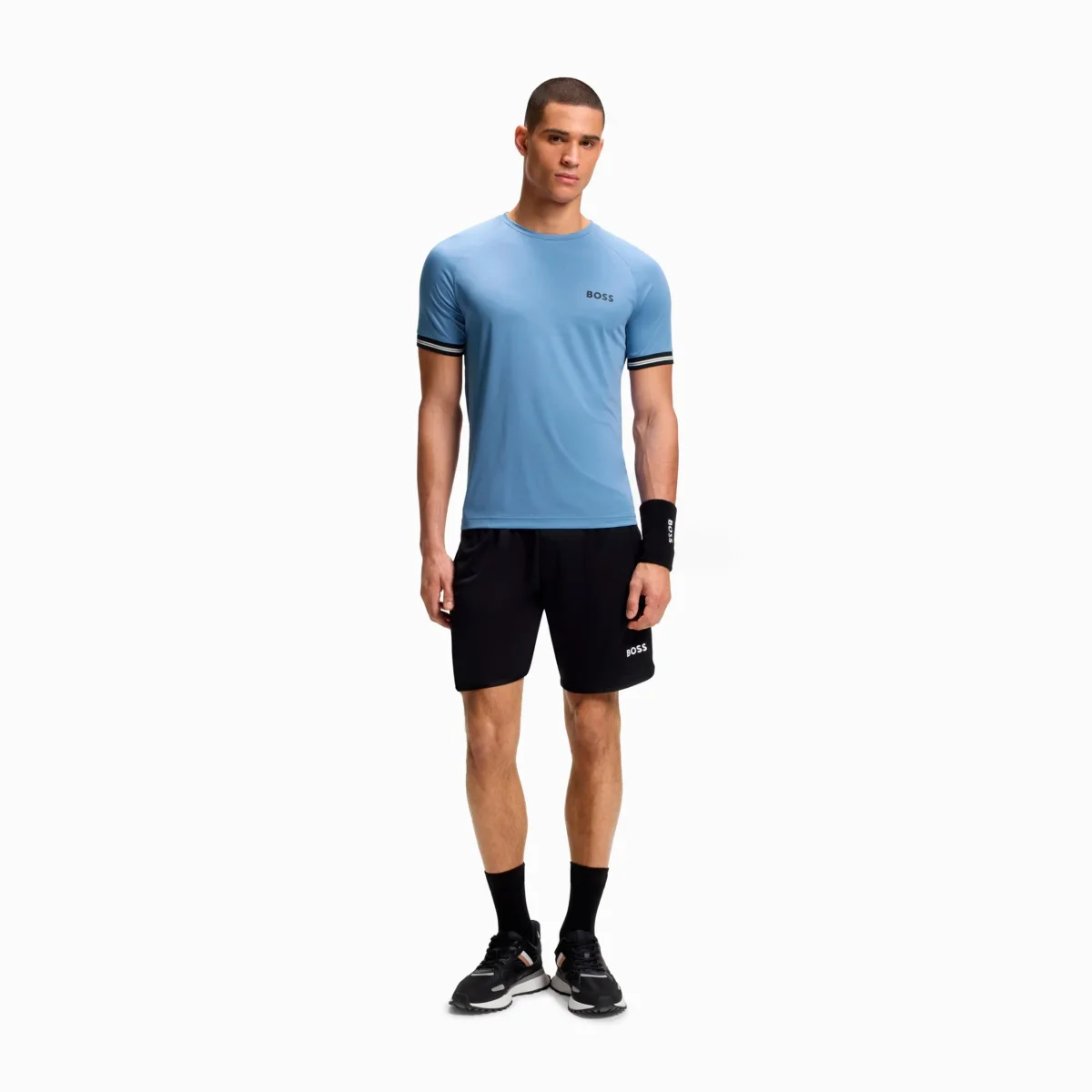 Är du redo för nästa tennismatch? Med Serve 2 T-shirt Herrar från BOSS är du inte bara utrustad med stil, utan också med prestanda. Denna t-shirt, som är framtagen för den moderna mannen, kombinerar högteknologiskt material och smart design för att hålla dig sval och bekväm under spelets hetaste ögonblick. Tillverkad av 97% återvunnen polyester och 3% polyester, erbjuder detta plagg en hållbar lösning utan att kompromissa med kvaliteten. Det korta ärmarna och den lätta konstruktionen säkerställer maximal rörlighet på tennisbanan, samtidigt som den klassiska stilen gör den till en favorit även utanför planen.