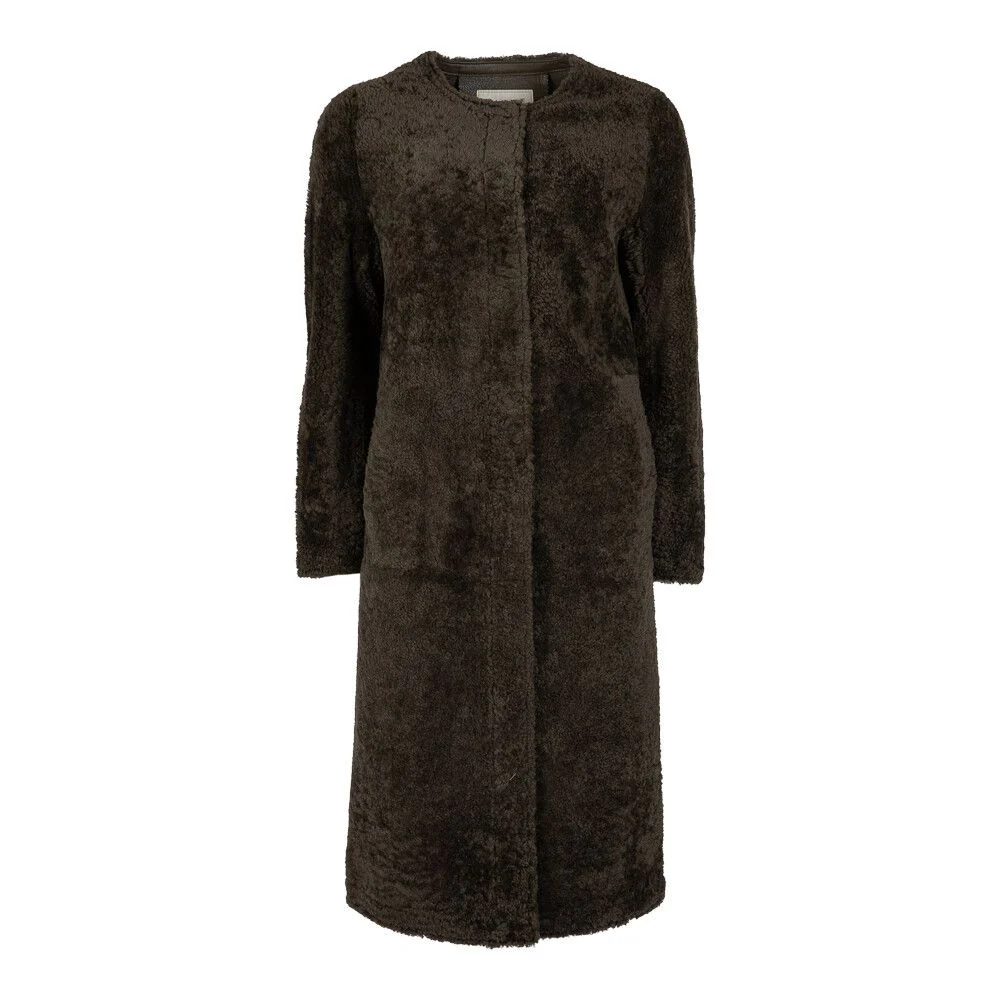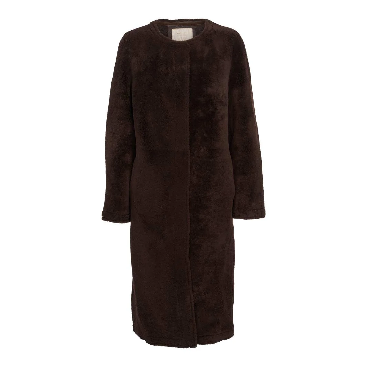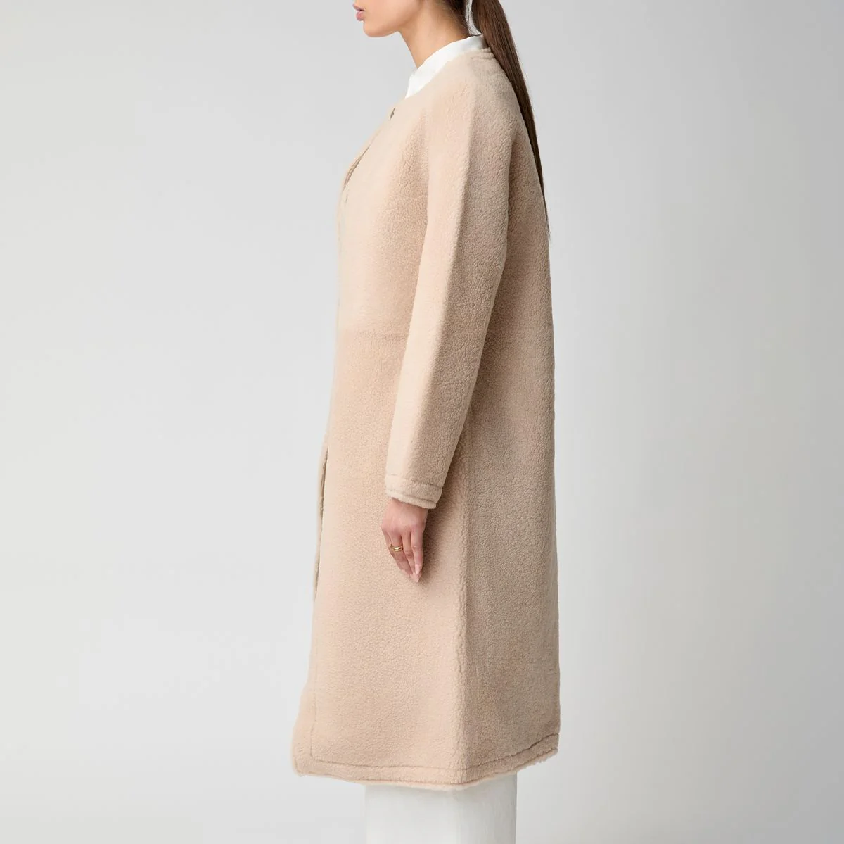 Sevilla, en lång mjuk kappa av exklusivt dubbelsidigt fårskinn i en enkel design. Den har en stilren silhuett utan krage vilket ger kappan ett klassiskt intryck som gör att den aldrig blir omodern.