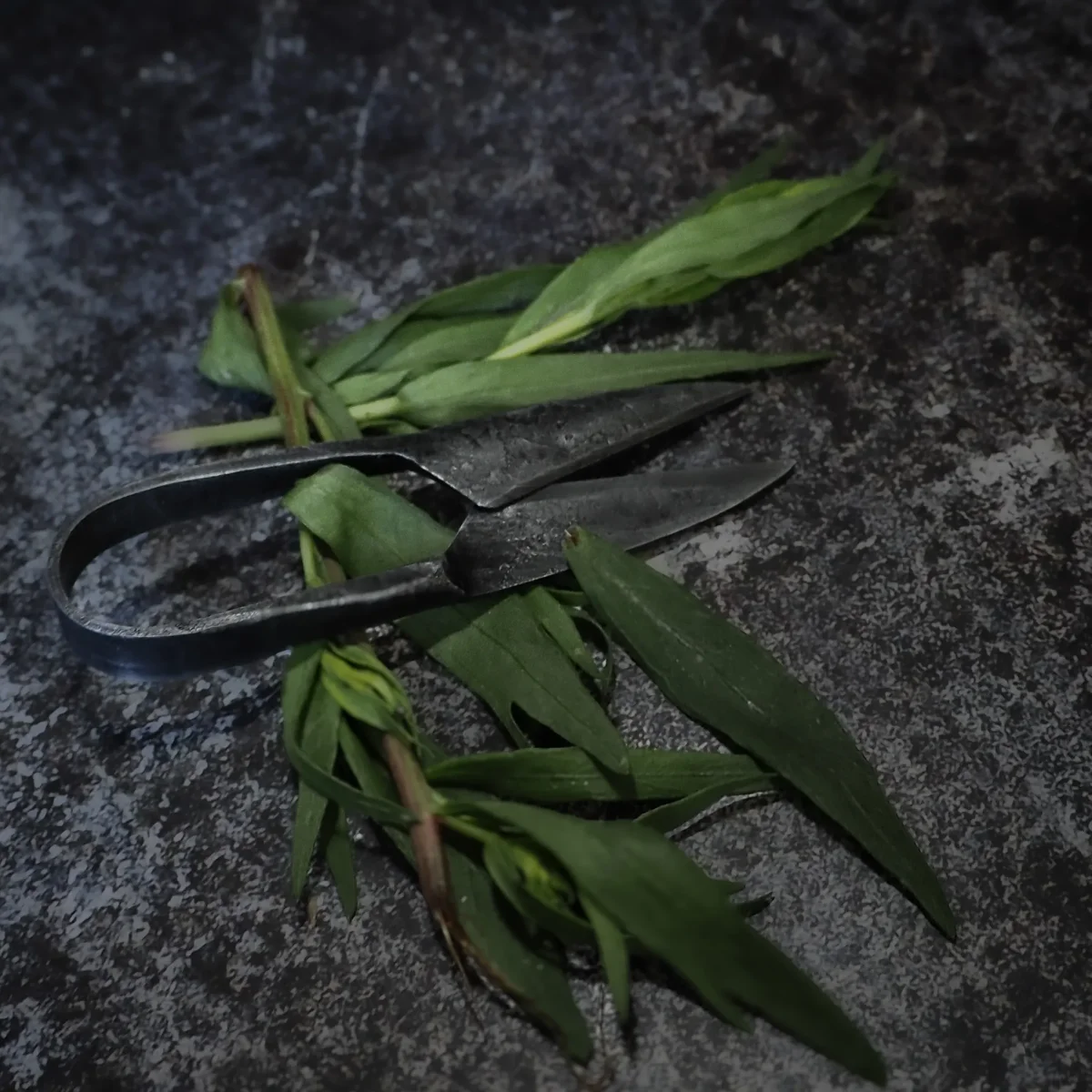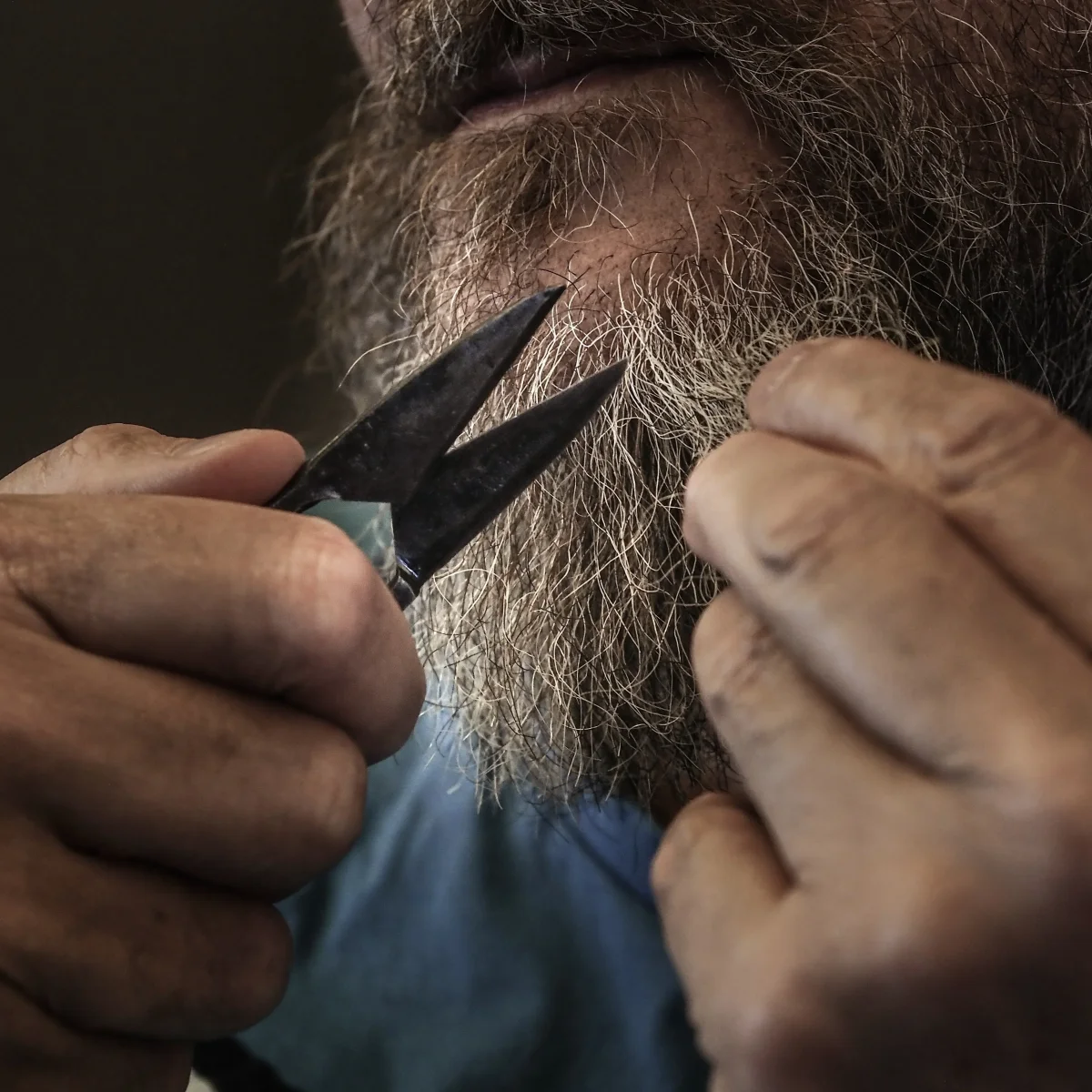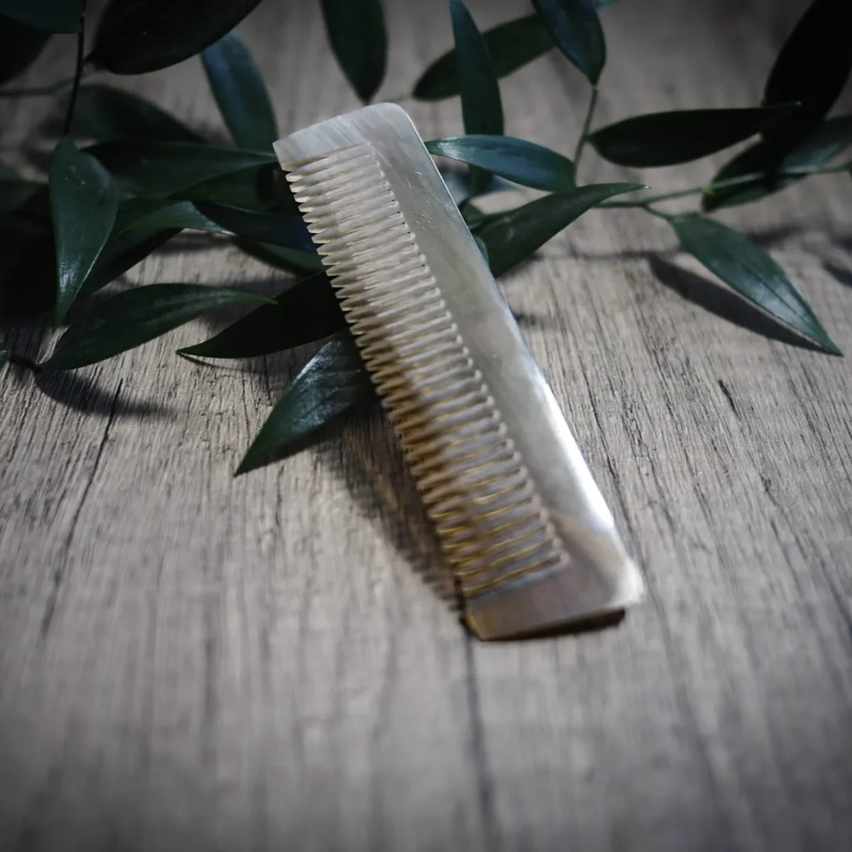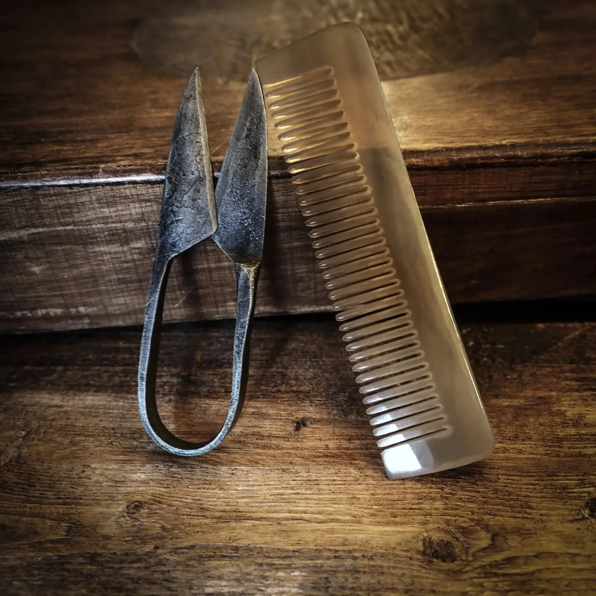 Ett kit för ett vikingaskägg, bestående av en sax i smide och en skäggkam i horn. Den lilla enkla lilla saxen och kammen är perfekt till att trimma och tygla både skägg och mustasch.