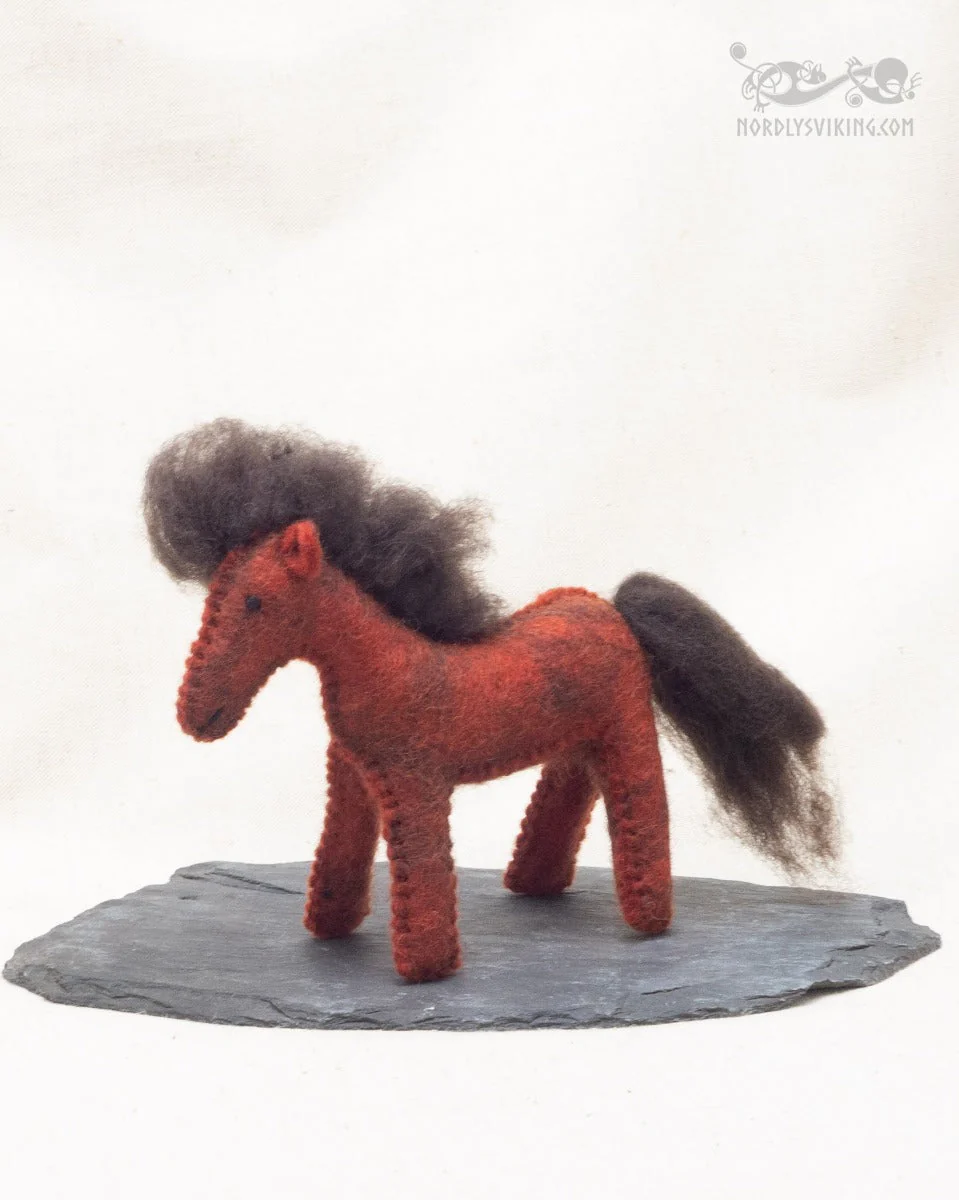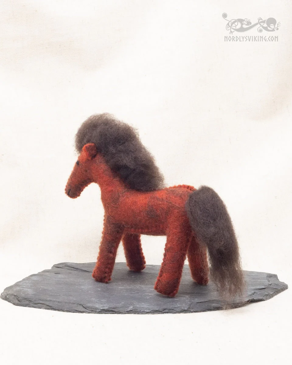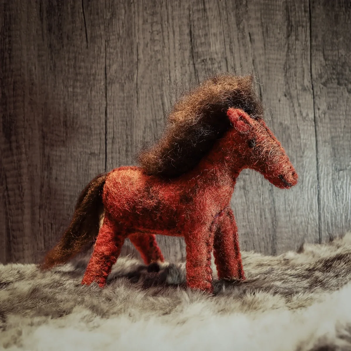 Tovad fux färgad häst i brunmelerad ull. Alla våra tovade djur är fria från plastmaterial och färgade med vattenbaserad giftfri färg. Tovningen görs helt utan skadliga kemikalier. Det är bara varmt vatten och såpa som tillsätts. Även stoppningen är 100% ull.