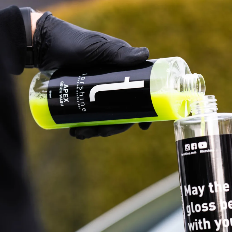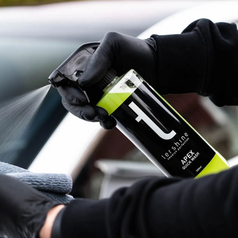 Tershine Apex är en quick Wash/Detailer speciellt framtagen att användas om man vill boosta glansen och inte tvättmöjligheter finns, exempelvis vid bankörning, rally, bilträffar etc. Tack vare sin unika sammansättning lyfter den smuts från ytan och efterlämnar en skyddande hinna. Fungerar ypperligt som en ”vanlig” quick detailer och ger riktigt bra tryck i glansen på nolltid!