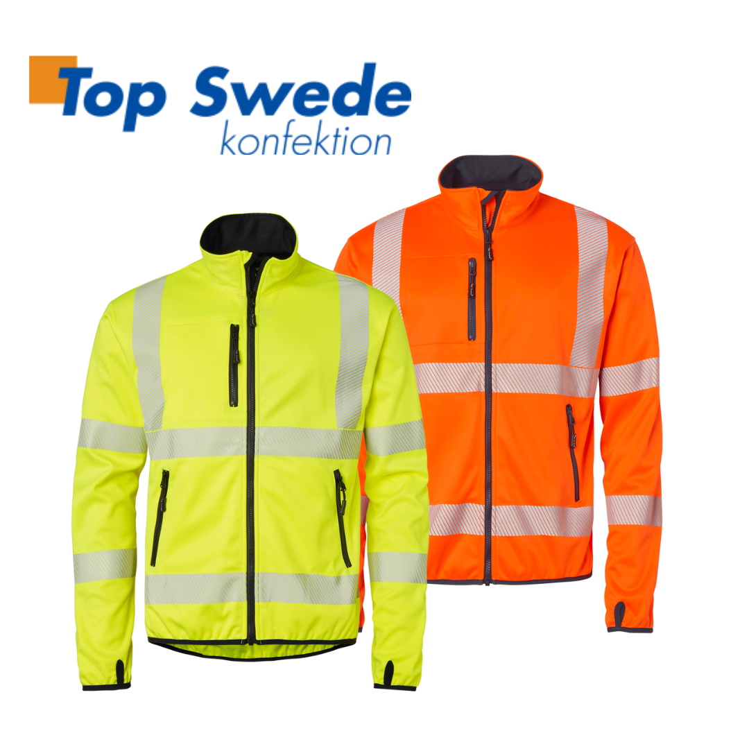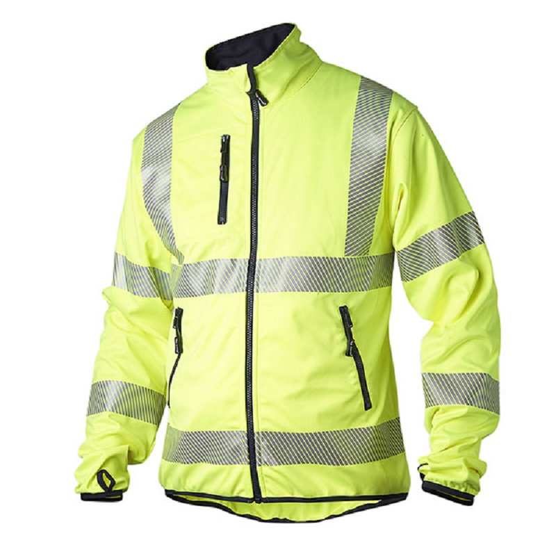 Softshell med hel dragkedja och kedjeskydd. En bröstficka/telefonficka med dragkedja. Två framfickor med dragkedja. Elastiskt ärmslut med tumgrepp. Elastisk i nederkant. EN ISO 20471 klass 3