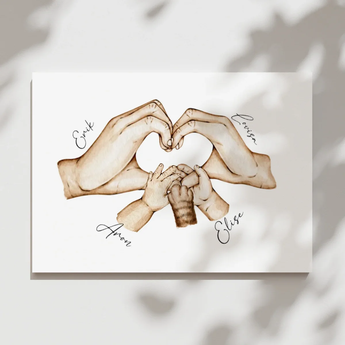 En stilren personlig poster med handmålade händer som illustrerar just er familj. Barnens händer håller i föräldrarnas på ett fint sätt och symboliserar familjens kärlek. Vid varje hand kan namnet på familjemedlemmarna skrivas för en extra fin personlig touch.